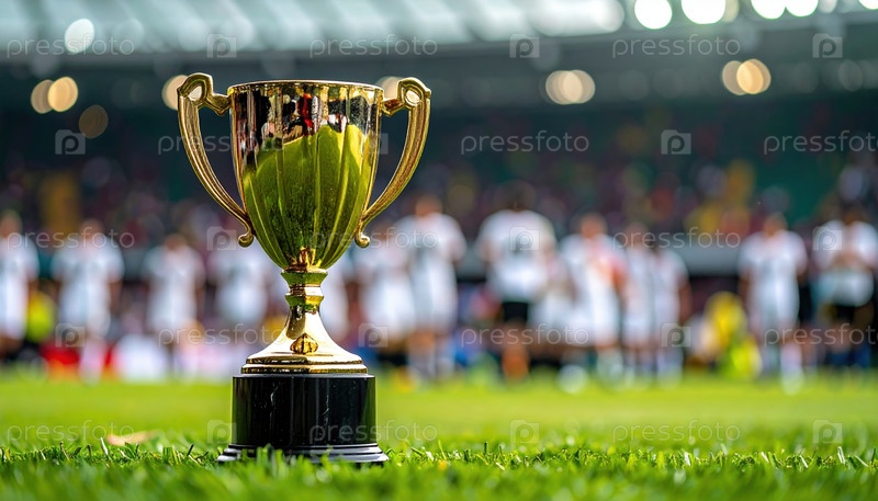 Золотой трофей на футбольном поле символизирует победу, командную работу и успех, отмечаемые в современном стадионе во время летней чемпионской игры, отражая амбиции и дух достижений