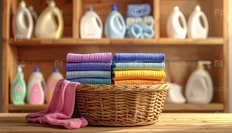 Красочные сложенные полотенца в плетеновой корзине с бутылками моющих средств на деревянных полках представляют собой домашний уход, гигиену и чистоту в прачечной с теплой светлой атмосферой