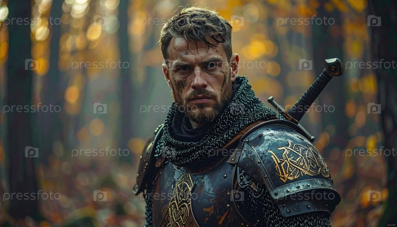 Бронированный воин с мечом в осеннем лесу символизирует храбрость, боевое сопротивление, средневековую силу и вечный человеческий дух перед лицом вызовов истории и легенд