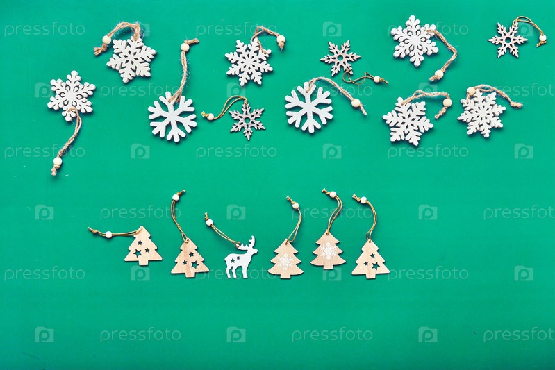 Рождественская композиция с деревянными рождественскими украшениями на синем фоне.Рождественская открытка, концепция новогодних поздравлений