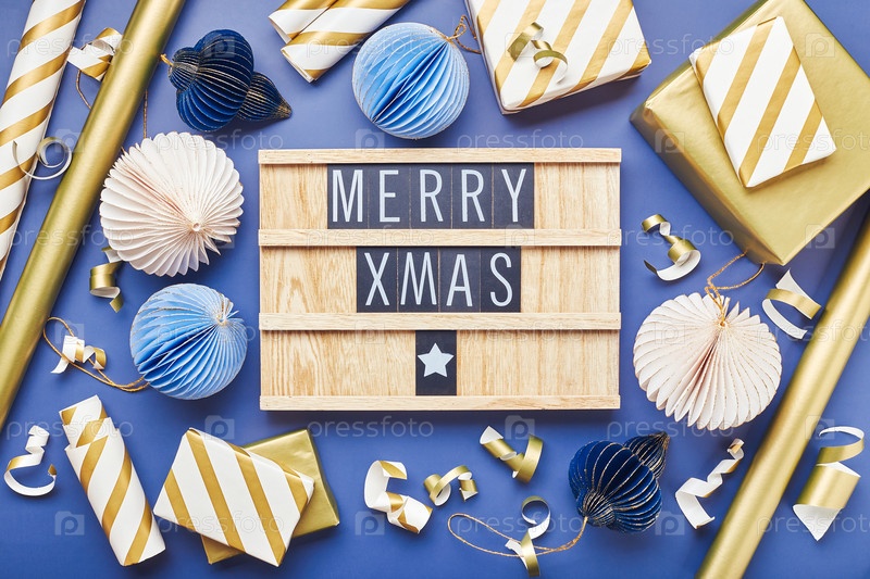 Письменная доска с текстом 'Веселые Рождества' с рождественским украшением на синем фоне