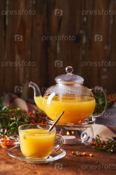 Стеклянный чайник и чашка с морской терной на деревянном фоне.Уютная осенняя композиция