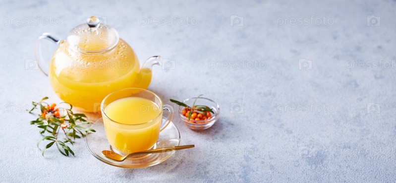 Стеклянный чайник с морским гречневым чаем на светлом фоне. длинный широкий баннер