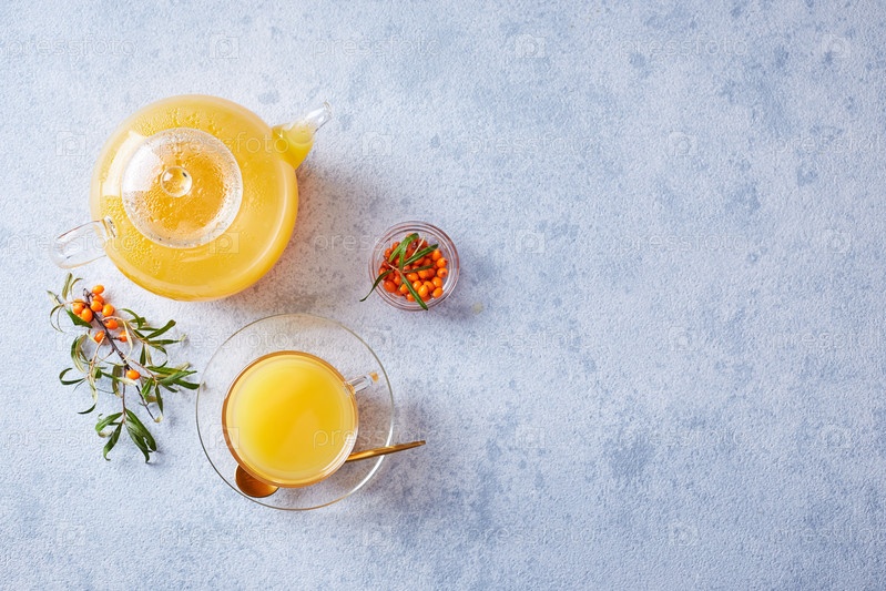 Стеклянный чайник с морским гречневым чаем на светлом фоне