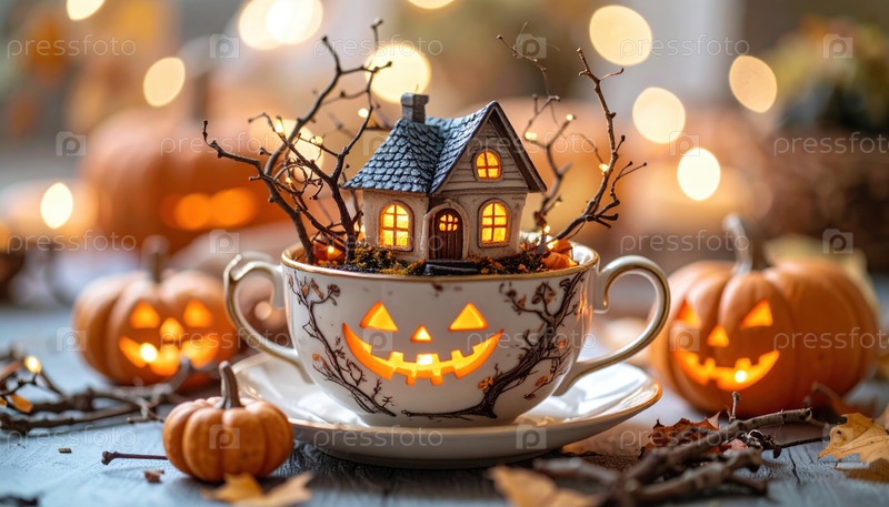 Тематический чайник на Хэллоуин с лицом фонаря и миниатюрным призрачным домом, символизирующим жуткие традиции, уютные осенние ночи и творческое сезонное украшение