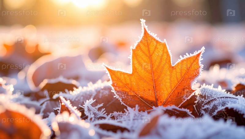 Макрофотография замерзшего осеннего листа на снежном грунте, освещенного восходом солнца, представляющая переход между сезонами и тонкий баланс природы и обновления