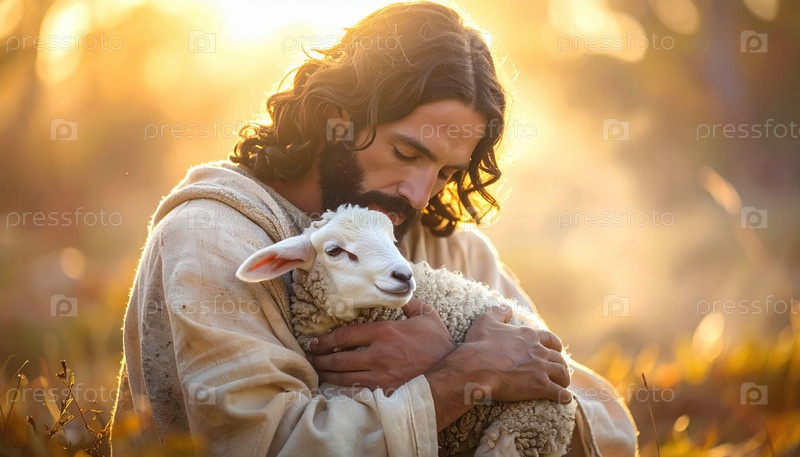 Символическое изображение человека, держащего ягненка в золотом свете, представляющее темы заботы, духовности, защиты и сострадания, часто связанные с пасхальными или религиозными традициями