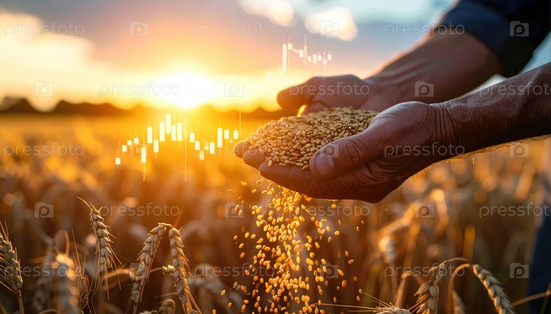Руки, держащие золотые зерна пшеницы с наложением графика фондового рынка при закате солнца символизируют торговлю сельскохозяйственной продукцией, продовольственную безопасность, цены на сырьевые товары и глобальные экономические тенденции