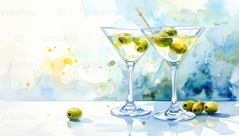 Два стакана мартини с оливками, раскрашенными в акварель, символизирующие праздник, искусство, образ жизни, удовольствие и культурный символ общественных собраний по всему миру
