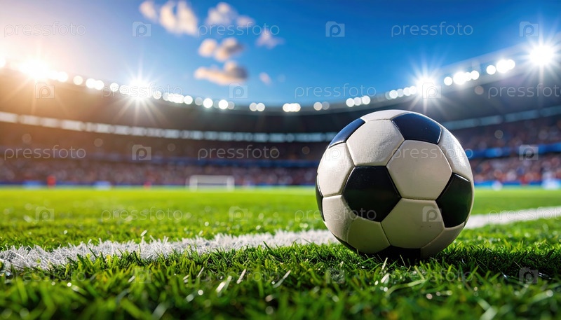 Футбол на зеленом поле с огнями стадиона в фоне, представляющий мировое спортивное первенство командной работы и энергию футбольной культуры