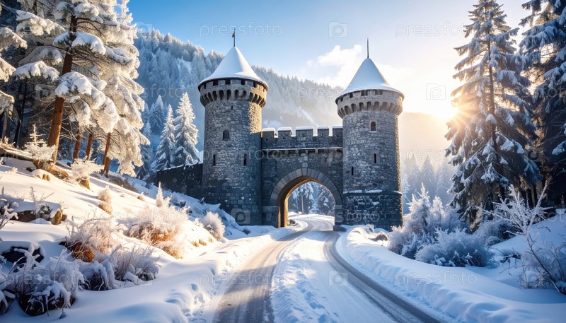 Средневековые каменные ворота в снежном лесу, освещенные солнечным светом, символизируют вечную историю, очарование зимнего путешествия, фантастическое вдохновение и сказку вроде европейского пейзажа