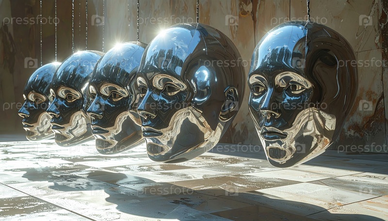 Металлические лица выровнены как колыбель Ньютона, отражающая солнечный свет, представляя искусственный интеллект, человеческие связи, инновации и концепцию технологического баланса современного искусства