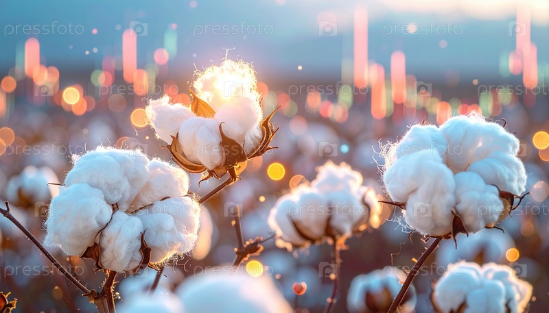 Закрытые хлопковые куски, светящиеся на солнце, символизируют сельское хозяйство, природные ресурсы, устойчивость и тенденции текстильной промышленности на мировых рынках