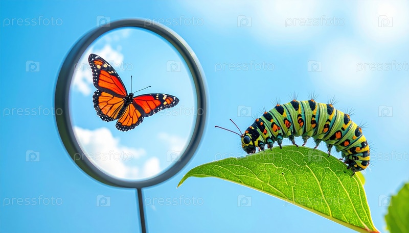 Гусеница на листе под голубым небом с увеличителем, показывающим бабочку, символизирующую трансформацию, рост, эволюцию и красоту жизненных изменений