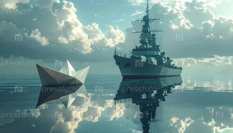 Бумажная лодка, стоящая перед большим военным кораблем в тихом океане под облачным небом, символизирует мужество, мечты, инновации и контраст между простотой и силой в современном мире