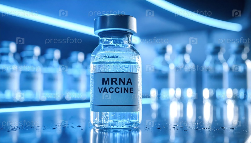 Медицинская флаконка, помеченная вакциной mRNA под синим светом, символизирует современную медицину, биотехнологии, инновации в здравоохранении и борьбу с глобальными заболеваниями