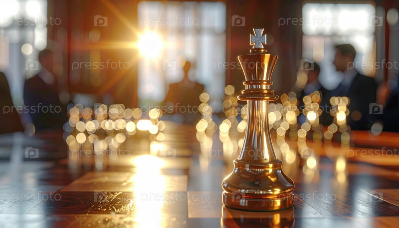 Золотая фигура шахматного короля, стоящего под утренним солнечным светом в конференц-зале, символизирует силу стратегии лидерства и принятия решений в бизнесе и конкуренции