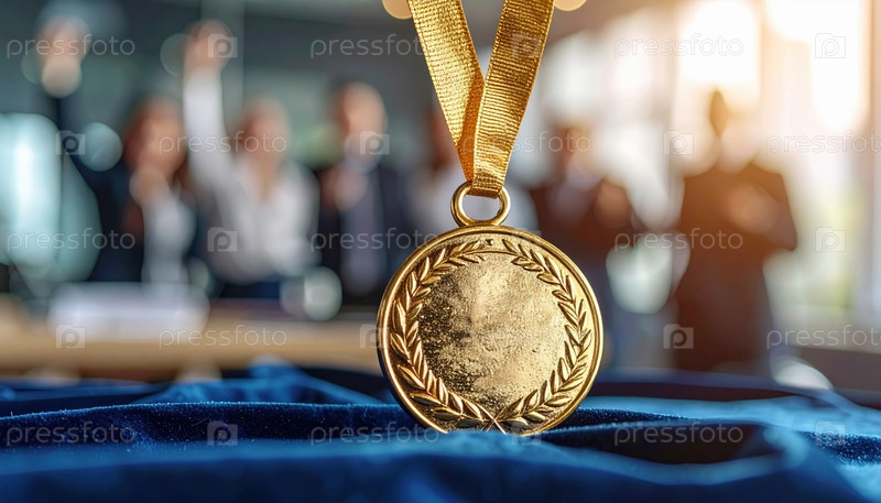 Золотая медаль с лентой, помещенная перед веселой деловой командой в офисе, символизирует признание, корпоративную победу, успех и празднование выдающейся работы