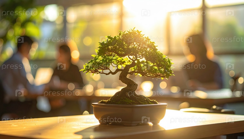 Дерево бонсай светит под солнечным светом в современном офисе с размытыми людьми на заднем плане, символизирующими рост, баланс, терпение, устойчивость и гармонию в бизнесе