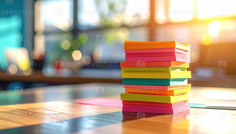 Куча красочных наклеек на деревянном столе под ярким офисным солнечным светом, представляющая творческую производительность планирования командной работы и организации идей во время современного рабочего дня