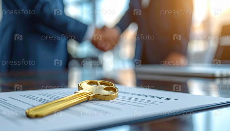 Золотой ключ от контрактного документа, символизирующий успешное партнерство в инвестициях в недвижимость и доверие к профессиональной деловой среде
