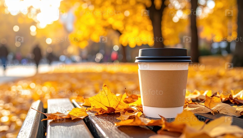 Кофейная чашка для одноразового использования на скамейке в парке среди золотых осенних листьев отражает сезонные изменения, расслабление и городское бегство с теплыми тонами осеннего листа при закате