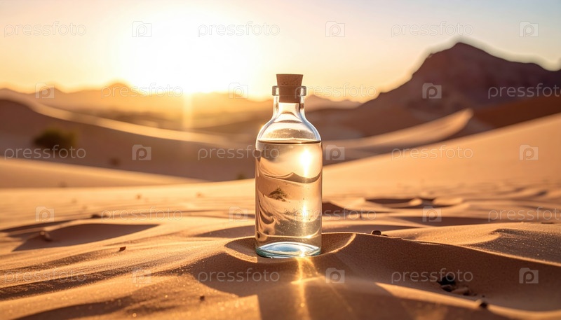 Стеклянная бутылка с водой, стоящая в конце пустыни, символизирует надежду на выживание, отсутствие изменения климата и ценность природных ресурсов в засушливых ландшафтах