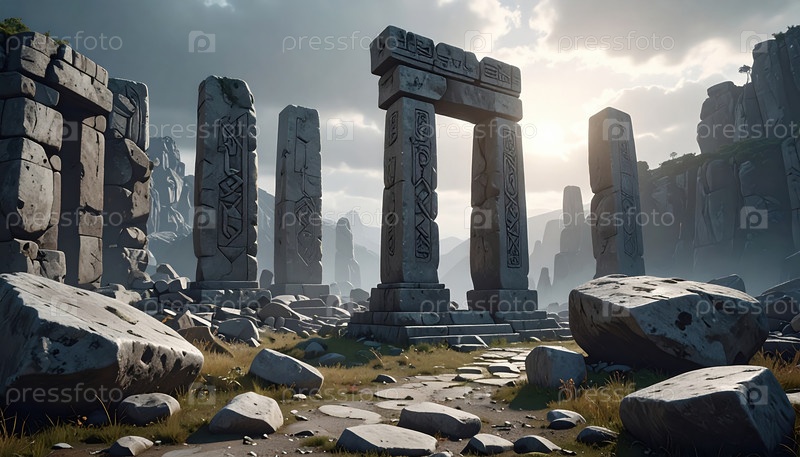 Древние каменные столбы в мистической долине с резьбой, предполагающей забытые руины цивилизации, идеально подходят для фэнтезийной приключенческой темы или концепта исследования, вдохновленного историей