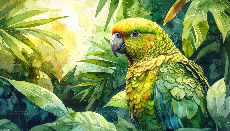 Акварельный попугай в зелени тропических джунглей, символизирующий экзотическую дикую природу, биоразнообразие, сохранение тропических лесов и яркое разнообразие природы