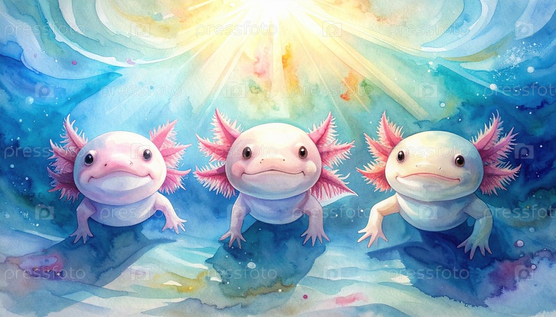 Три улыбающиеся аксолотлы под светящимся водяным светом в стиле искусства акварели, символизирующие уникальность исчезающих земноводных и радостную фантазию, как водный мир