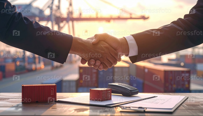 Деловое рукопожатие в морском порту с контейнерами на заднем плане символизирует успешное торговое соглашение, международное сотрудничество и глобальное логистическое партнерство