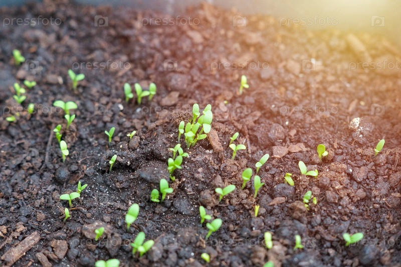Прорастание сороховой зелени из семян в солнечных лучах
