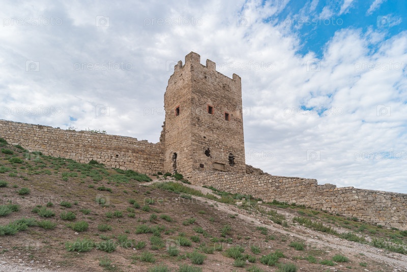 Крым, генуэзская крепость в Феодосии. вид на древнюю каменную башню и стену