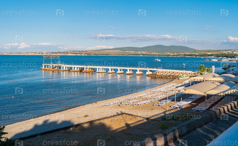 Геленджик, Краснодарский край, Россия. ландшафт Черного моря с видом на пляж и пирс. раннее утро бархатный сезон