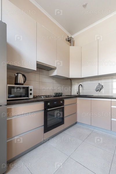 Современная бежевая кухня с обеденным помещением и черной столешницей