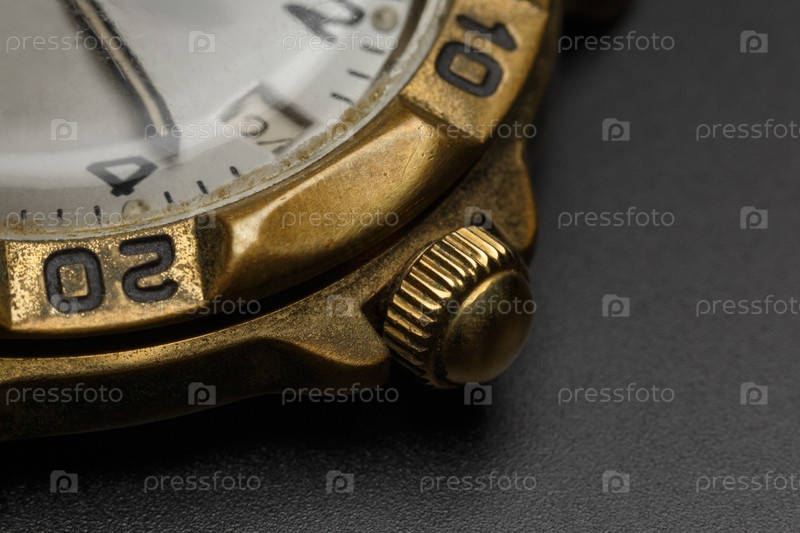Близкий медный корпус старых часов с вращающейся короной на боковой стороне