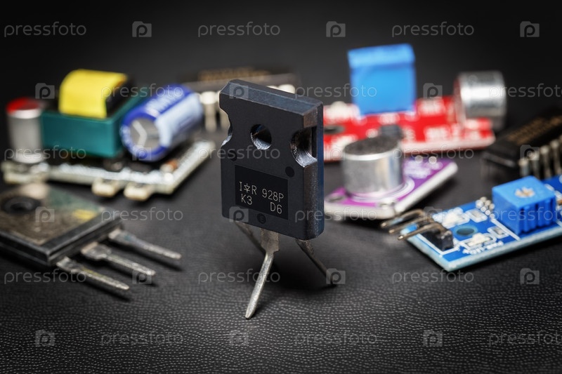 Близкий план мощного транзистора MOS в корпусе TO-247, окруженный различными радиокомпонентами на темном фоне