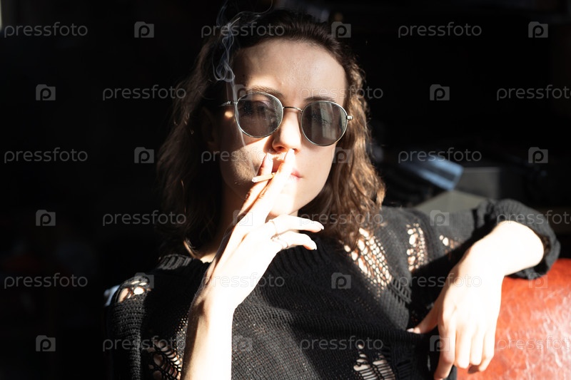 Портрет красивой молодой женщины в темных очках с сидячей сигаретой