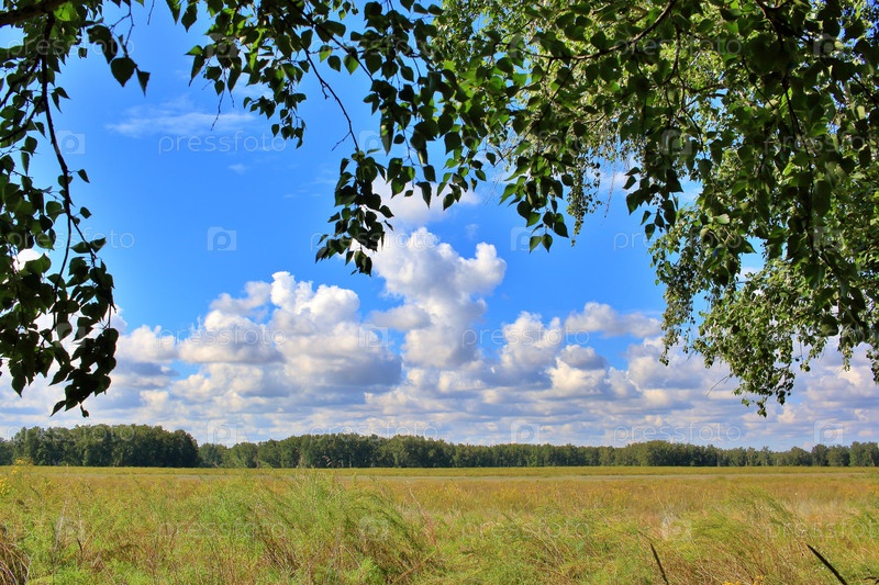 Сибирское поле в раме березовых ветвей на фоне облаков