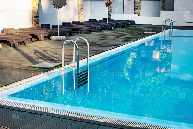 Наружный бассейн с металлической лестницей и шезлонгами вокруг