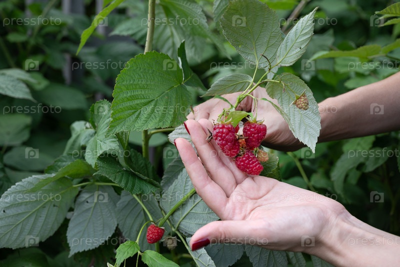 Садоводство, сбор урожая, концепция сельского хозяйства. Покрытие руки пожилой женщины, собирающей малину в открытом саду. Выборочное внимание к красной ягоде в руке