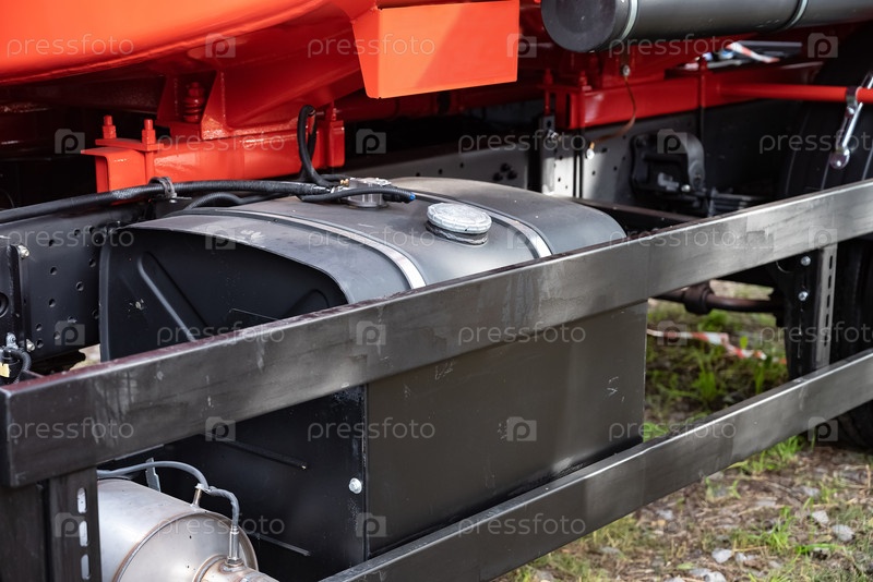 Близкий план топливного бака грузовика с ремнями на травяной и каменистой почве