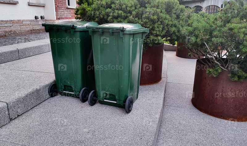 Две зеленые мусорные баки размещены рядом с большими плантаторами в чистой городской обстановке