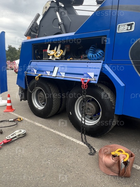 Техническое обслуживание тяжелых транспортных средств на стоянке с инструментами и оборудованием, выставленными в экспозиции