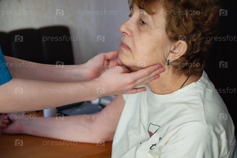 Женщина-врач касается горла пациента в кабинете