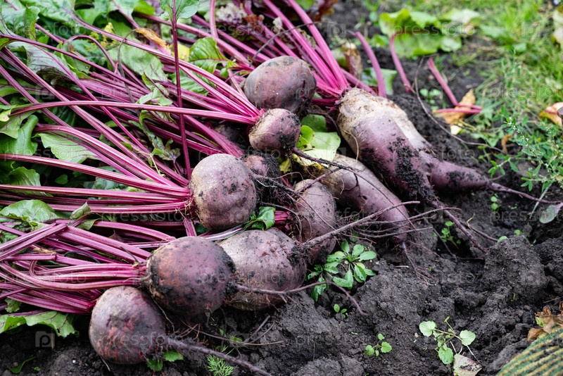 Свекла с глубокой фиолетовой кожей и зелеными листьями свеже вырыты из богатой темной почвы, демонстрируя тяжелую работу садоводства под ярким солнечным светом
