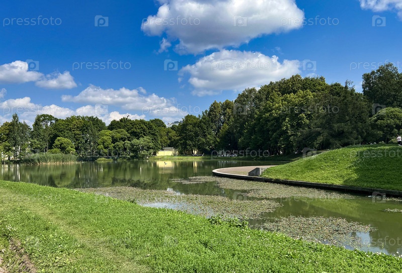 Спокойный парк с тихим прудом, окруженным пышной зеленью и деревьями под чистым голубым небом