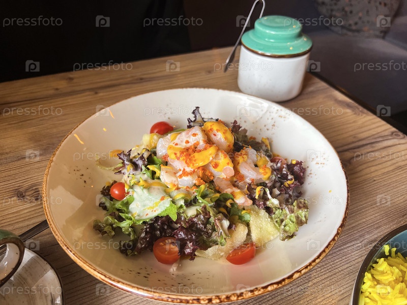 Свежий салат с креветками, хрустящими баклажанами и вишневыми помидорами подается в деревенском блюде