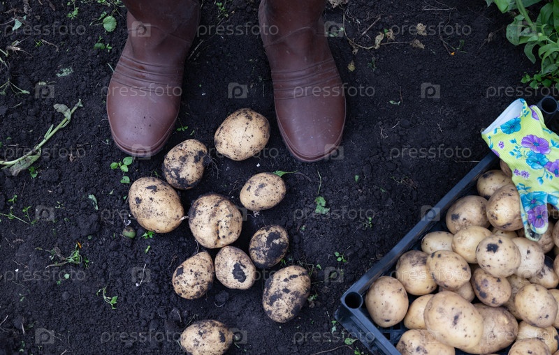 Сбор свежевыросших картофелей в солнечный день в саду с покрытыми землёй руками и резиновыми ботинками
