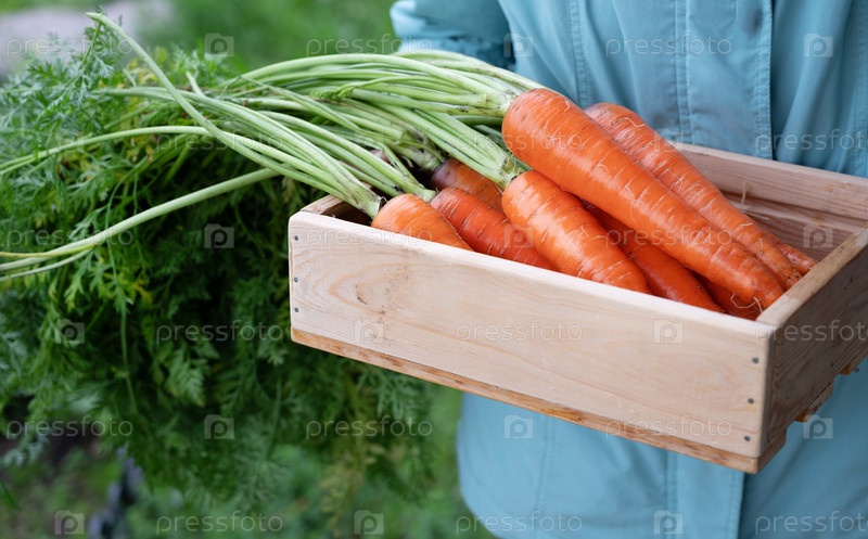 Сбор свежих морков в саду в солнечный день